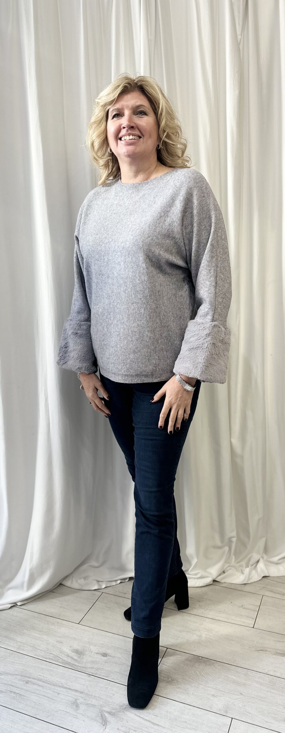 Plain Jumper with Faux Fur Cuffs in Grey